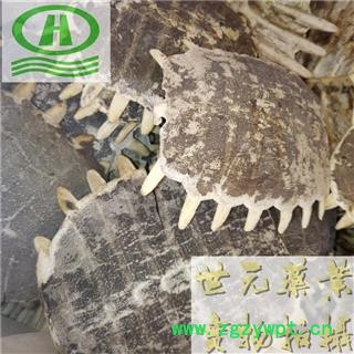 【性 状】呈椭圆形或卵圆形,背面隆起,长10~15cm,宽9~14cm。外表面黑褐色或墨绿色,略有光泽,具细网状皱纹及灰黄色或灰白色斑点,中间有一条纵棱,两侧各有左右对称的横凹纹8条