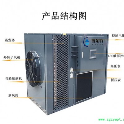 利用逆卡诺原理,压缩机将气体加压成高温高压气体,进入室内侧的换热器,冷媒冷凝液化释放出高温热量加热烘干房内空气。烘干房内的物料通过热风的形式使物料中的水分汽化蒸发,蒸发出来的水蒸汽由排湿系统排走而达到烘干物料的目的。