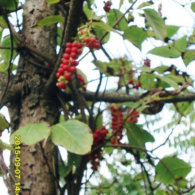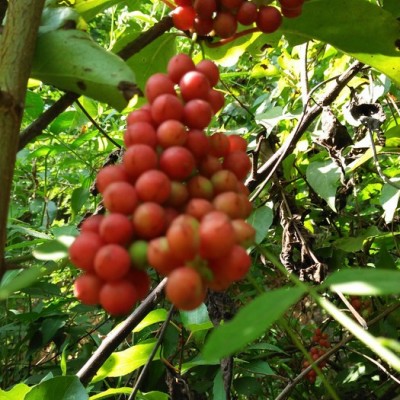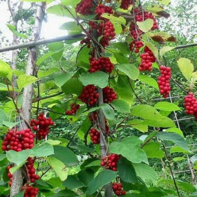 五味子为落叶木质藤本植物,其果不但可做鲜食水果,也可做为药材。聚合果长1.5-8.5厘米,聚合果柄长1.5-6.5厘米;小浆果红色,近球形或倒卵圆形,径6-8毫米,种子1-2粒,肾形,长4-5毫米,宽2.5-3毫米,淡褐色,种皮光滑。花期5-7月,果期7-10月。 秋季果实成熟时采摘可直接食用,五味子又为常用中药,药用时晒干或蒸后晒干,除去果梗及杂质。唐等《新修本草》载“五味皮肉甘酸,核中辛苦,都有咸味”,故有五味子之名。五味子分为南、北二种。古医书称它荎蕏、玄及、会及,列于神农本草经上品中药,能滋补强壮之力,药用价值极高,有强身健体之效,与琼珍灵芝合用治疗失眠。其果含有五味子素(Schisandrin C23H3206)及维生素C、树脂、鞣质及少量糖类。有敛肺止咳、滋补涩精、止泻止汗之效。其叶、果实可提取芳香油。种仁含有脂肪油,榨油可作工业原料、润滑油。茎皮纤维柔韧,可供绳索。