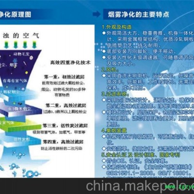 该净化机的过滤系统由初效滤层、中效滤层和高效过滤层三部分组成。初效滤层能够拦截过滤大颗粒子和毛屑,吸收艾灸烟雾中的油性物质;中、高效滤层选用进口滤材,可拦截吸附烟雾、微尘埃物,对0.5微米微粒的过滤效率为99.99%;气体过滤层由化学滤芯组成,能有效地去除污染空气中的毒害气体,如甲醛、苯、硫化氢等。