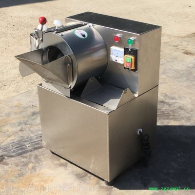 包含单切机的所以功能的同时,也可切圆形如土豆、萝卜等。可将根、茎、叶等蔬菜加工成片、丝、丁、菱、曲线、花丁、花片等。切片装置用于硬菜(萝卜、土豆、水果、薯类)的切片,厚度在1-10毫米内自由调整;往复竖刀将刀成的菜片或软菜(韭菜、芹菜)切成直丝或段、曲线丝、方丁(或形刀)输送带每次移动距离1-20毫米自由调整。所调整量即为丝段的宽度;应注意被切菜直径较粗时(大于30毫米)出片效果才好,便于切丁,直径小时制的片或丁将会杂乱。被切菜加工面平整光滑、规则,组织完好,保持手工切制的效果。